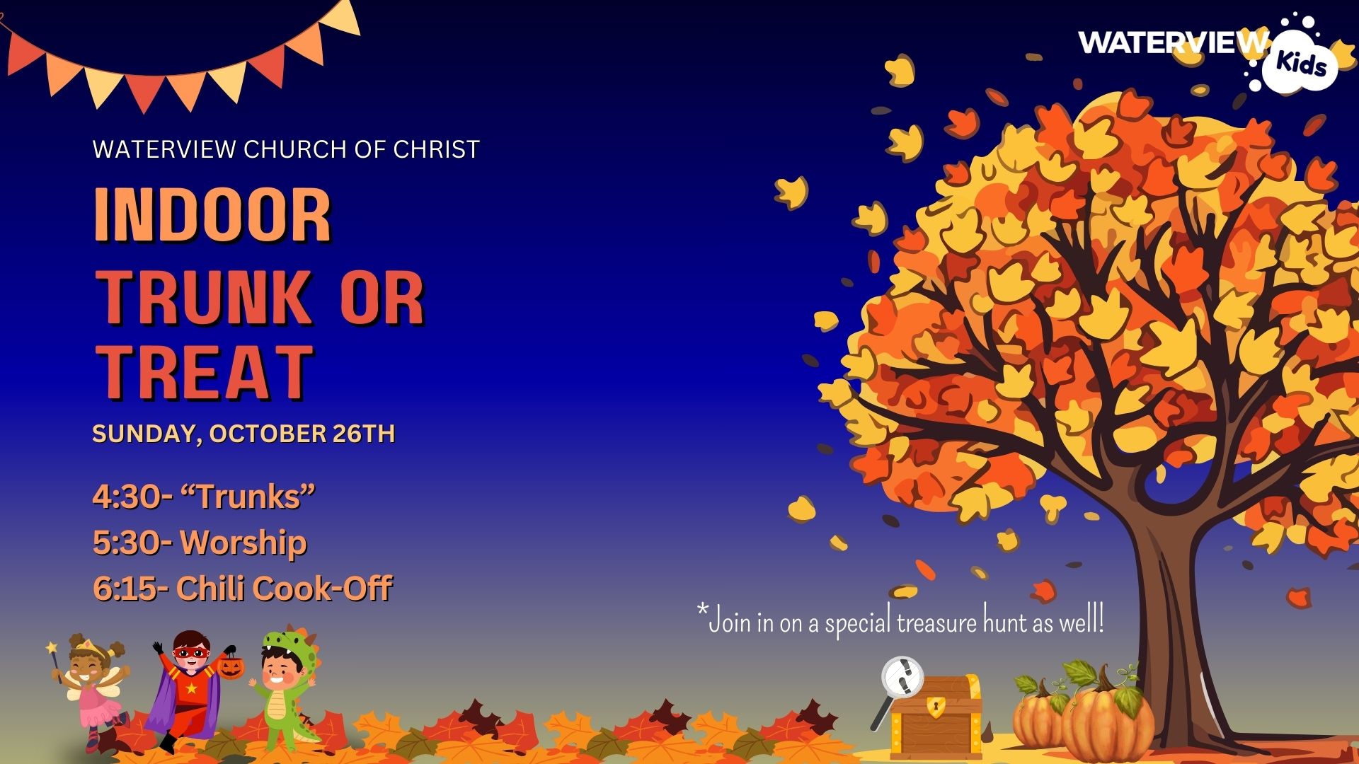 On October 26th, come join us at 4:30 inside our building for indoor Trunk or Treating! There will be games and activities for kids; and you may find some coffee available as well! At 5:30 join us for Worship in the south fellowship area followed by a Chili Cook-Off.